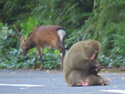 シカとサルが同時に道に出ている (鹿児島県屋久島)