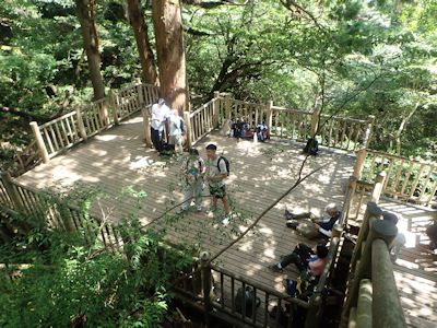 縄文杉の展望デッキ。疲れた人々が座って休んでいる