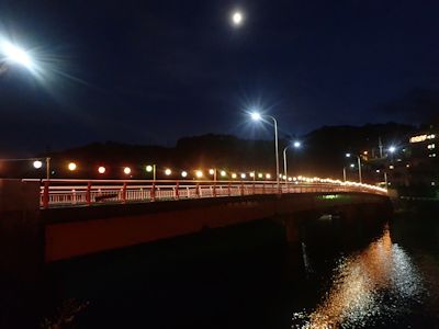 安房川橋が提灯でライトアップされる。月夜 (鹿児島県屋久島)