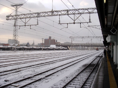 雪景色の郡山駅、7:40AM |