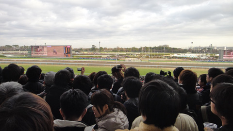 いよいよレース。本場馬側に移動したが、もう馬場が見えるような場所は残っていなかった。前には延々と人の海。背伸びをしても馬場は見えない。仕方なくここで二人して雰囲気だけを楽しむことにする。
