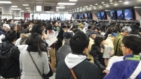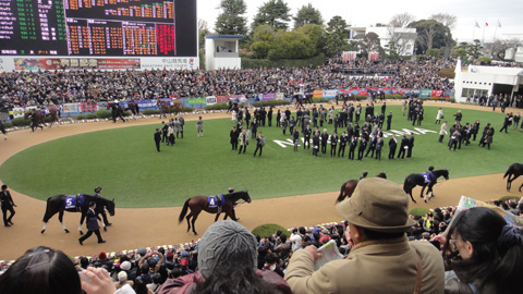 昼12時頃に船橋法典駅に着く。徹夜組がいるほどだから、こんな昼にノコノコ行くのは少数派なのかもしれないが、電車の中から駅からまだ溢れんばかりに人が多い。天気はもちそうだ。だが、今年はファン投票の1、2位であるオルフェーブルとジェンティルドンナが出走しないので、ひょっとしたら例年より観客数は少ないかもしれない。帰りの切符を買っておく。