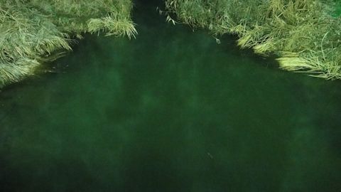 太田橋から見た真夜中の都川。吸い込まれそうな緑色 |