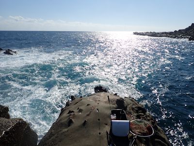 アイゴ以降全く釣れないので、13時ごろの干潮でミゾを渡って隣の岩に移る。昨日大魚が見えた場所である。