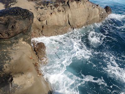 3mの磯竿の先にメタルジグをつけ、玉網が落ちたあたりの海底を探る。深さは4〜5mくらいだろうが、海中は見えない。幸いなのは玉網は重いので、波で流されたりせずに落ちたところに沈んでいることがほとんどであることだ。