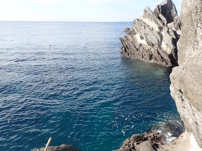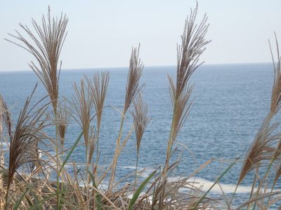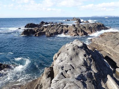 そうして、すでに閉園してしまった「サボテンハーブ園」下の、通称「ビョウブ岩」と呼ばれる磯に降りてみる。感じはサンメッセ下と同様で、長い磯場があるのだが、まともに波が打ちつける正面は浅くてフカセ向きではない。が、南側の端がちょっと深くて足場もよく、フカセ釣りに最適だ。