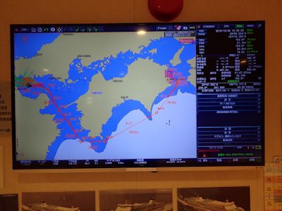航路を表示したモニター。瀬戸内海ではなく、四国の南を周る |