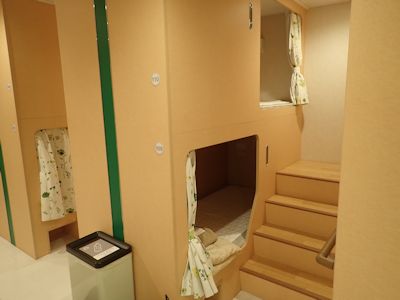 私はもちろん、一番安い大部屋。しかし、「二等船室」で思い浮かべるタコ部屋ではなく、段ボールハウスのような2段の箱型のカプセル状寝床が並んでいる。カプセルホテル並みのプライバシー確保じゃないか。いい。