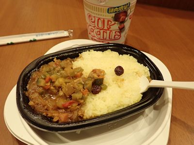 しょぼい夕食。冷凍食品のカレーにカップヌードル |