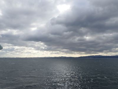 チェックインして無事フェリー「どうご(道後)」に乗りこむ。車でスロープを上がり、船の割と上の方に開口部があって、そこに車格納庫がある。