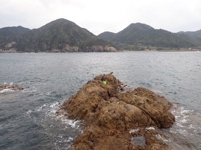 3人にどこで釣るか聞いてみると、先端とその次の岩あたりで3人釣るとのことなので、仕方なく陸側の入江状のポイントに竿を出すことにする。