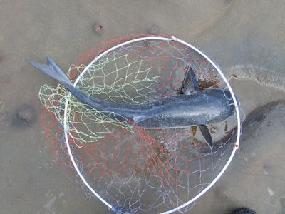 波をかぶりながら、ボラを玉網に入れる。まさに決死の取り込み。よっしゃああああ。