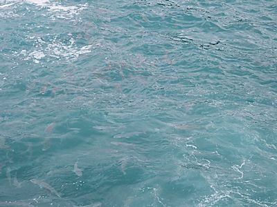 これは異様というか、もう海の神秘に脱帽としか言いようのない光景である。ボラが海面を埋め尽くしているといっても過言ではない。