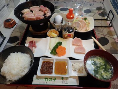 8時、旅館の朝食。薄味で内容もよく、満足。この朝食がついて1泊4650円(うち入湯税150円)ならば大変良い。