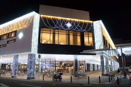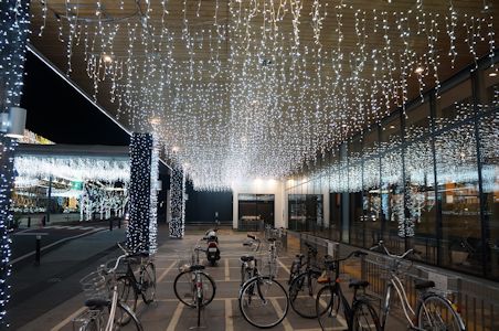 図書館の建物と、その周りの駐車場やビルが、まばゆいばかりのイルミネーションで飾られている。これもあまり見たことのない類の飾り付けられ方である。