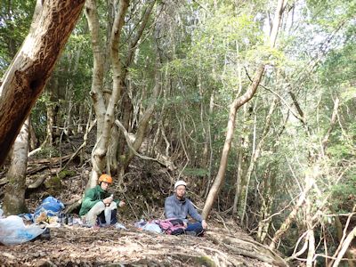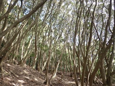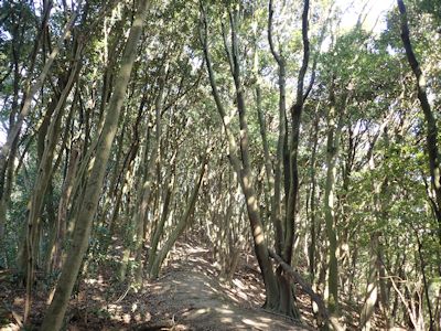 この山頂を降りると、尾根道沿いにマテバシイが一杯に生えている。木漏れ日を浴びながら白い幹が輝く。素晴らしい林である。