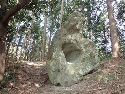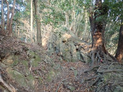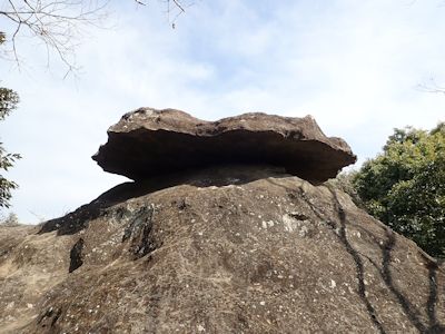経塚山山頂から少し降りたところにあるあんご岩。別名蛙岩 |