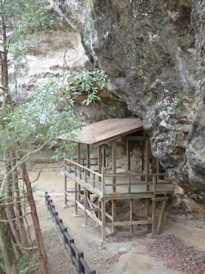 急な階段を上がると、岩壁を削って木造の堂をその半トンネルのような空間にしつらえている。寂光不動である。