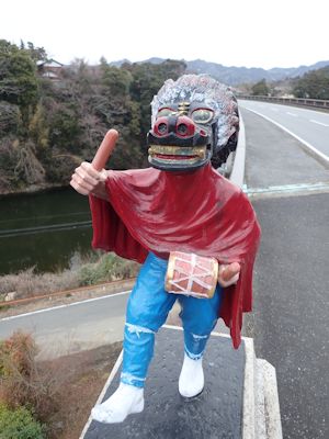 車が猛スピードで行き交っている。ちょうど三島大橋のたもとに出た。獅子をかぶって太鼓を叩く人の像が橋の親柱上に設置されている。獅子舞のような伝統だろう。いつも車から眺めるものだ。