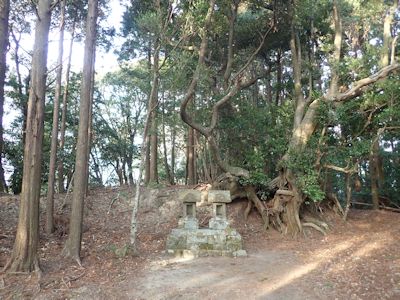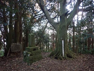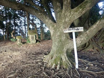 山頂には東屋があり、マテバシイとスダジイの巨木が立っている。その脇に石の祠が2つ。