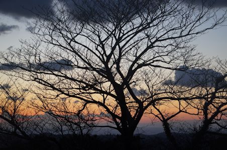 山頂から見る夕日があまりにもきれいなので見とれて写真を撮る。南西の方角には海が見える。東京湾だろう。そうこうしているうちに、日は没し、あたりが暗くなってくる。下山せねば。