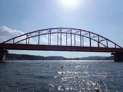 しばらく歩くと、右の斜面下に巨大な湖が見えてくる。三島湖である。赤い橋が架かっているのが見える。