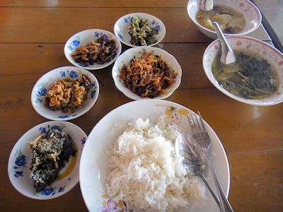 ミャンマーの食事。白飯にさまざまな付け合わせとカレー、スープ |