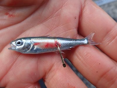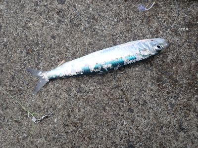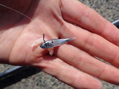 昼過ぎ、何かがハリに掛かったと思ったら、例の小魚だった。2〜3cmしかない、イワシの子どもか?ハリに串刺しになっている。不幸にも私のハリの周りにいたのだろう。