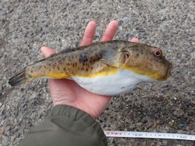 とても抜き上げられないので、玉網ですくい上げる。なんと、28cmのヒガンフグ。メジナやクロダイの大物記録は更新できないが、フグは最近着々と大物を釣り上げている。