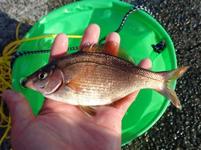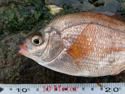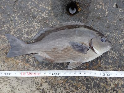 1時間ほど何も釣れなかったが、ウキがやや動いたところを合わせるとウミタナゴが釣れた。20cm。オレンジ銀の魚体が美しい。