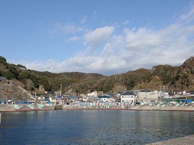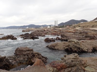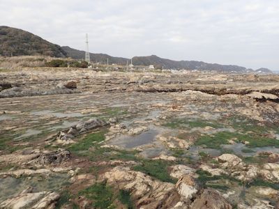実入港という小さな港への入り口が見つからず、行き過ぎたのでUターンして何とか見つけ、港方面に降りる。港横の漁具置き場のようなところに車を置かせてもらい、荷物を持って磯に向かう。