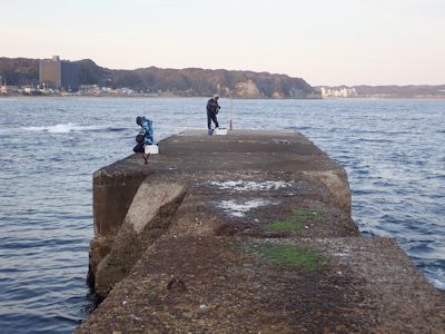 堤防先端に行くと、釣り人はすでに3人いる。いずれもアジのカゴ釣りのようだ。