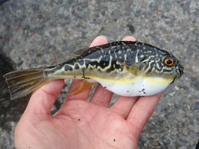 いつものクサフグとは模様が違う(浜行川港) |