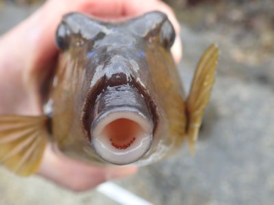 その後は、ぽつぽつと釣れ、ウミタナゴが3、小メジナ1、フグが1。フグは見慣れたクサフグとは模様が違う。後でネットで調べると、「ムシフグ」という種か。