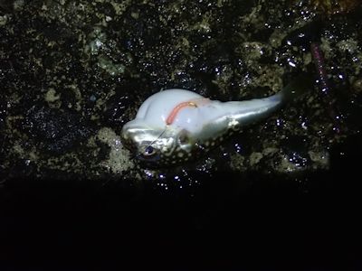 4時半ごろ、昨日と同じく、そこらじゅうにいる3cmくらいの小魚が、運悪くハリに刺されて上がってきた。