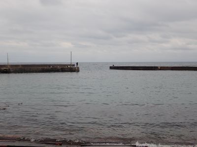 部原港の左右の堤防。手前が船揚げ場。ここが内港側のカマスポイント |