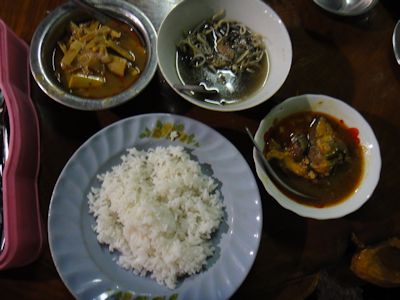 ミャンマーの典型的食事。白飯にカレー的煮つけの品々