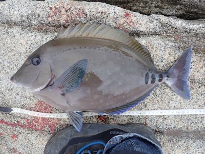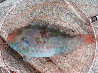 ブダイだった。何とかタモ入れ成功し、重い魚を引き上げる。40cm。