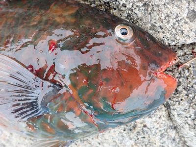 ちなみに、ブダイは雌雄で見た目が違う。ブダイというのはアカササノハベラをでっぶりと太らせたような見た目をしている。大泊の地磯で釣ったのは雌で、雌は色はアカササノハベラみたく、赤みがかったピンク色で、大小の斑紋が入っている。一方、雄は青みがかっている。実は釣った時は、何しろ釣ったことがなかったのでアオブダイか?とも思ったのだが、家に帰った後ネットで質問してブダイの雄だと確認できた。