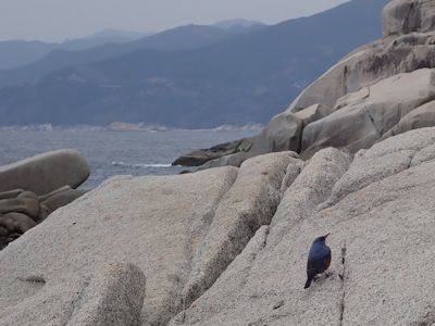 ここの磯では、釣りの間にこぼれたコマセを狙って、鳥がいつもやって来る。家で調べてみると、イソヒヨドリのようだ。青いからだに、首下が橙色をしていて、美しい鳥である。オキアミ入りのコマセが好物のようで、決まってやって来る。