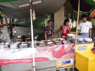ヤンゴンの屋台。銀色のボウルに様々なおかずが入っている