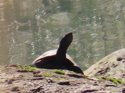 カメは岩の上に上がって日向ぼっこをしている。さすがに変温動物である爬虫類にはまだまだ季節は厳しい。