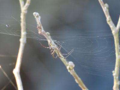 水平円網を張るクモ。アシナガグモ系だと思うが