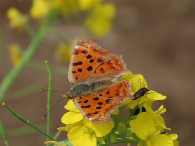 キタテハとハエかアブかが仲良く菜の花で吸蜜する。
