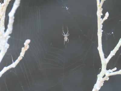 垂直円網を張る小さなクモ。きれいな円網なのでコガネグモ系だと