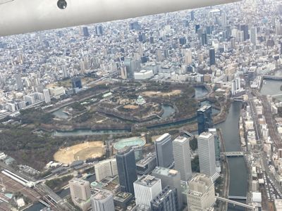 飛行機から見下ろす大都会・大阪と大阪城 |