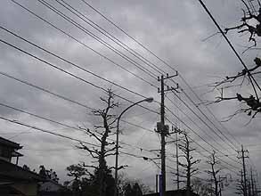 積層した灰色の雲と電線が低く抑圧する空(千葉市内) |