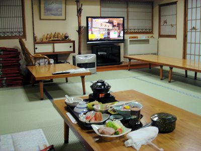 村上の民宿で夕食。誰もいない広間で豪華な食事