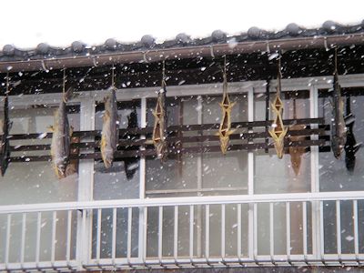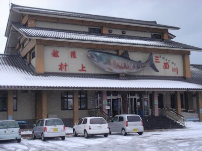雪は、降ったり止んだりしている。それと同期して空が暗くなったり明るくなったりする。『喜っ川』の後、浄念寺を周った後、鮭博物館のイヨボヤ会館へ。ここでは鮭の生態や養殖の展示、また伝統的鮭漁の紹介が行われている。村上の鮭文化を凝縮した建物である。ちなみに、イヨボヤとは、村上地方の方言で鮭のことである。
