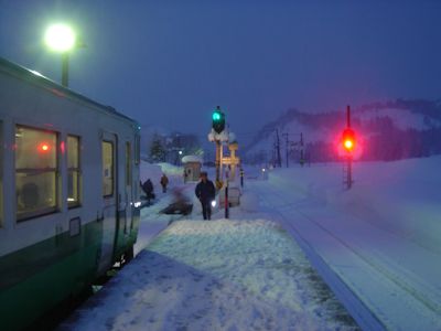 外は大雪のせいもあり、夕方でもう暗い。駅では、雪が街灯で鈍く光り始める。
